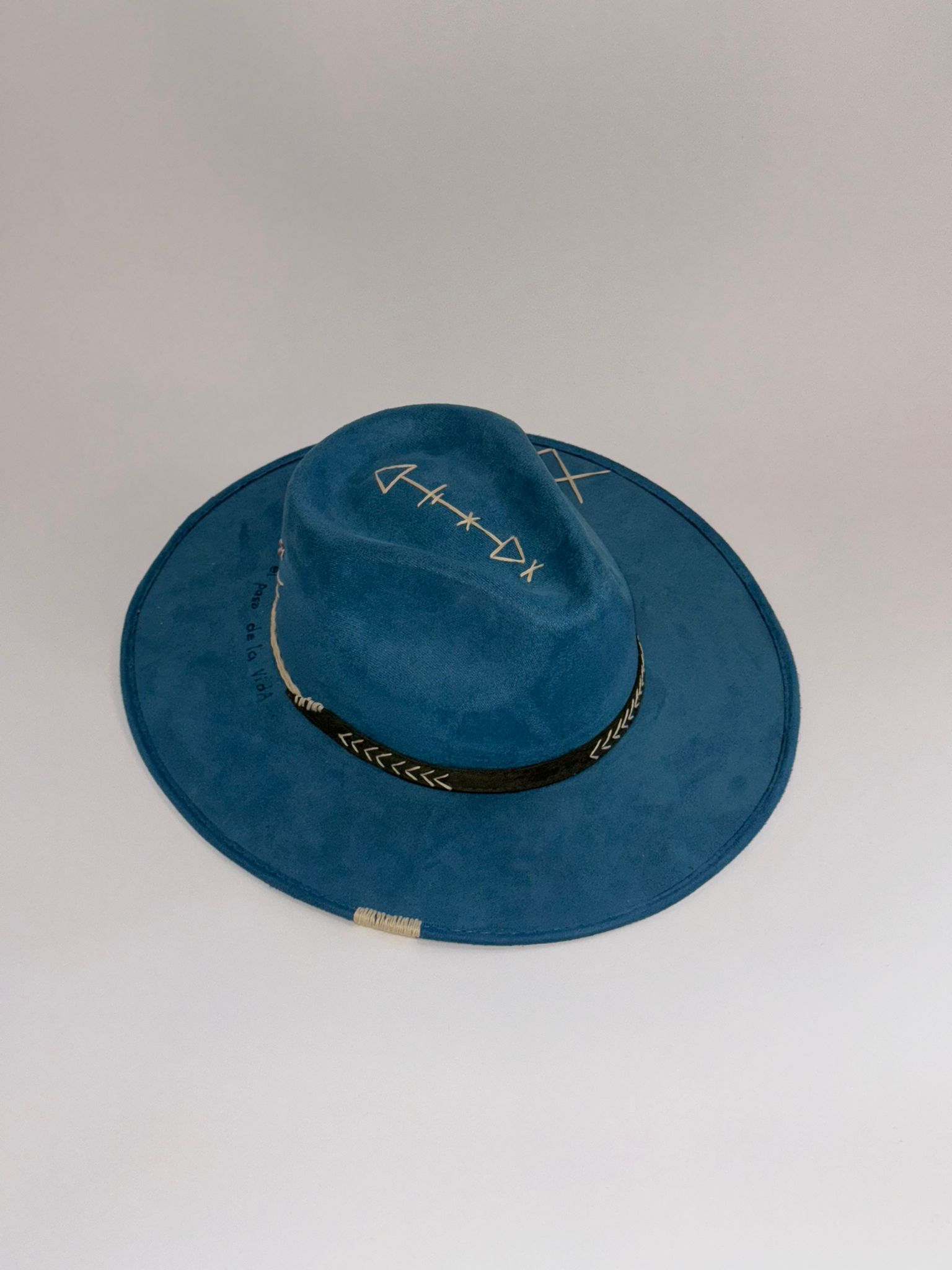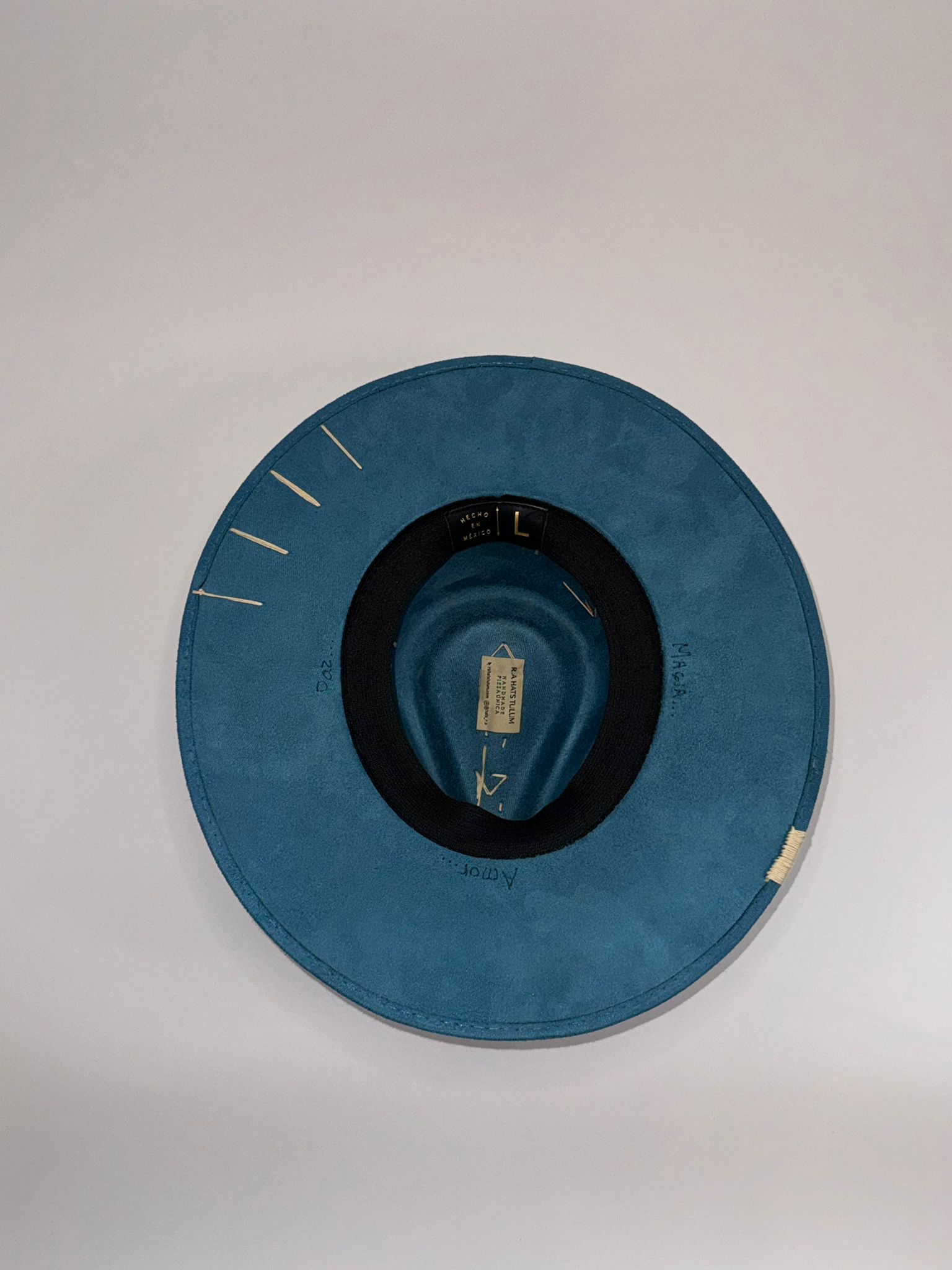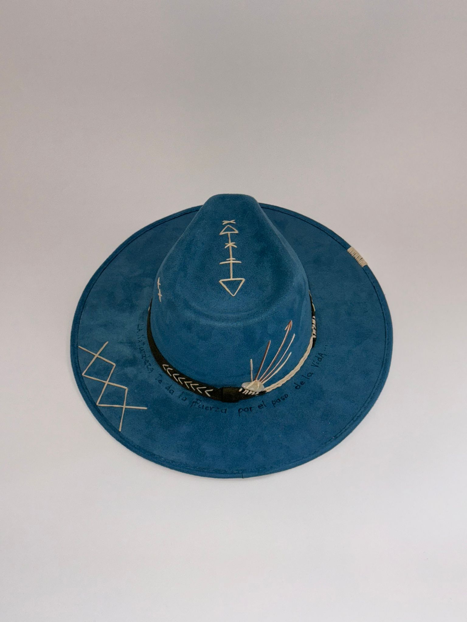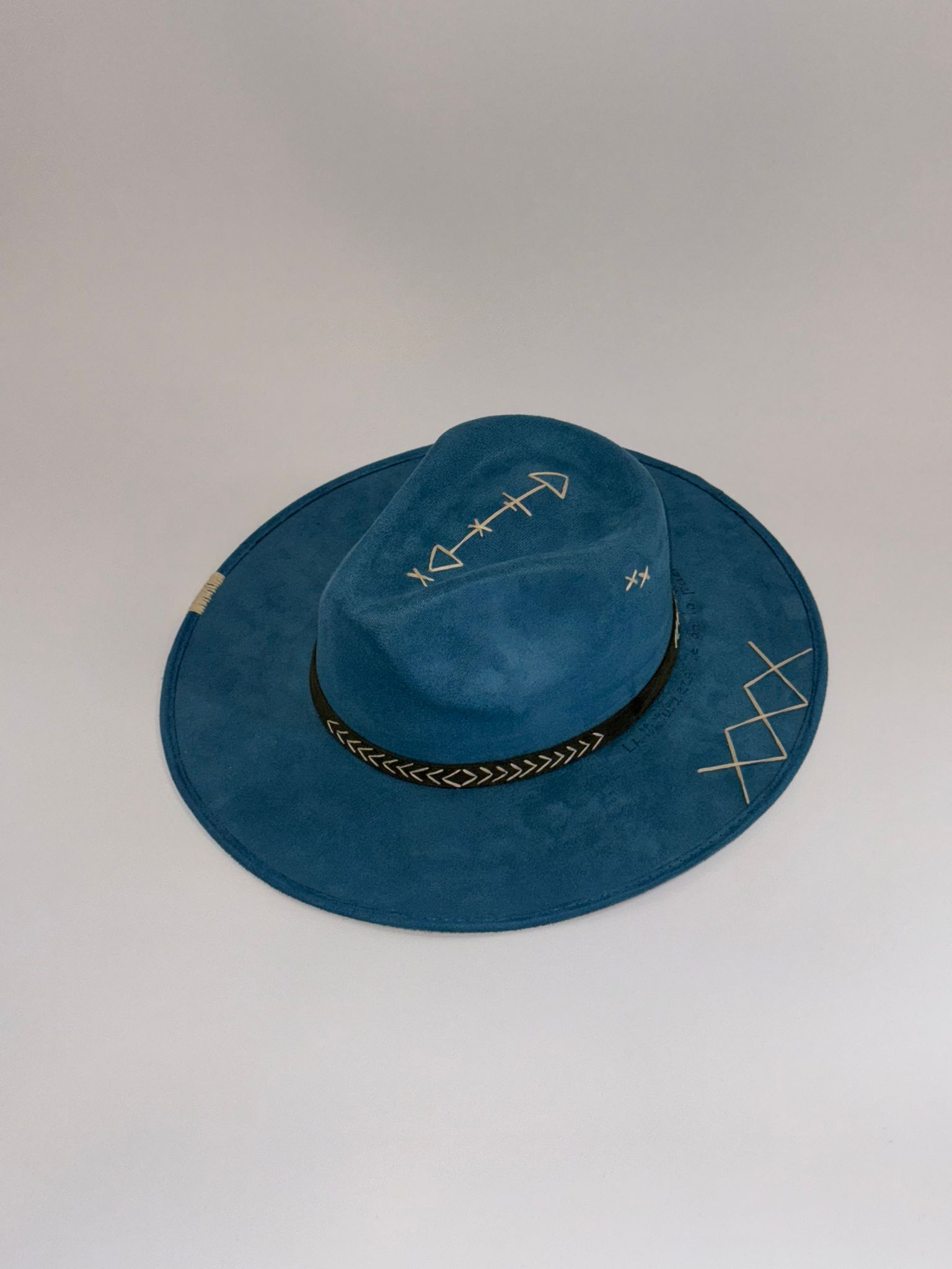 This is a large, handcrafted hat made from premium suede in a unique “Green Blue” color, blending earthy and vibrant tones for a distinctive look. The wide brim provides both sun protection and a bold silhouette, perfect for making a stylish statement. Intricate hand-stitched symbols adorn the crown, while a contrasting patterned band adds an additional touch of detail and character. The combination of the green-blue shade and artisanal touches makes this hat a striking accessory for those who appreciate craftsmanship and individuality in their fashion choices. Ideal for both adventurous outings and casual elegance.