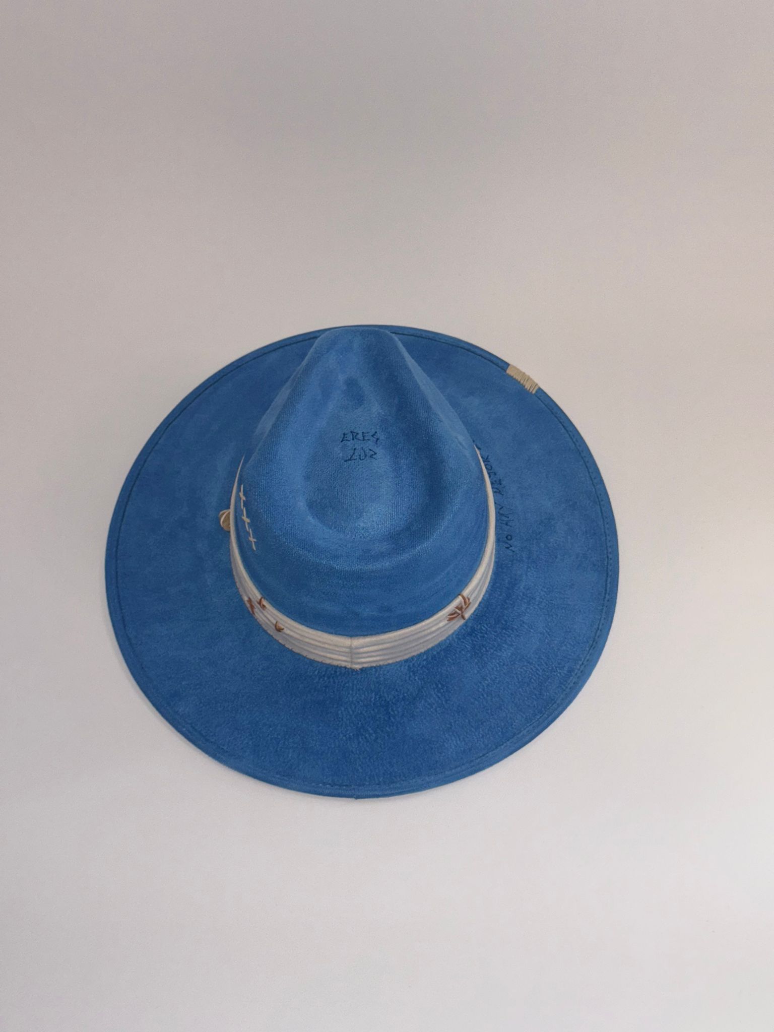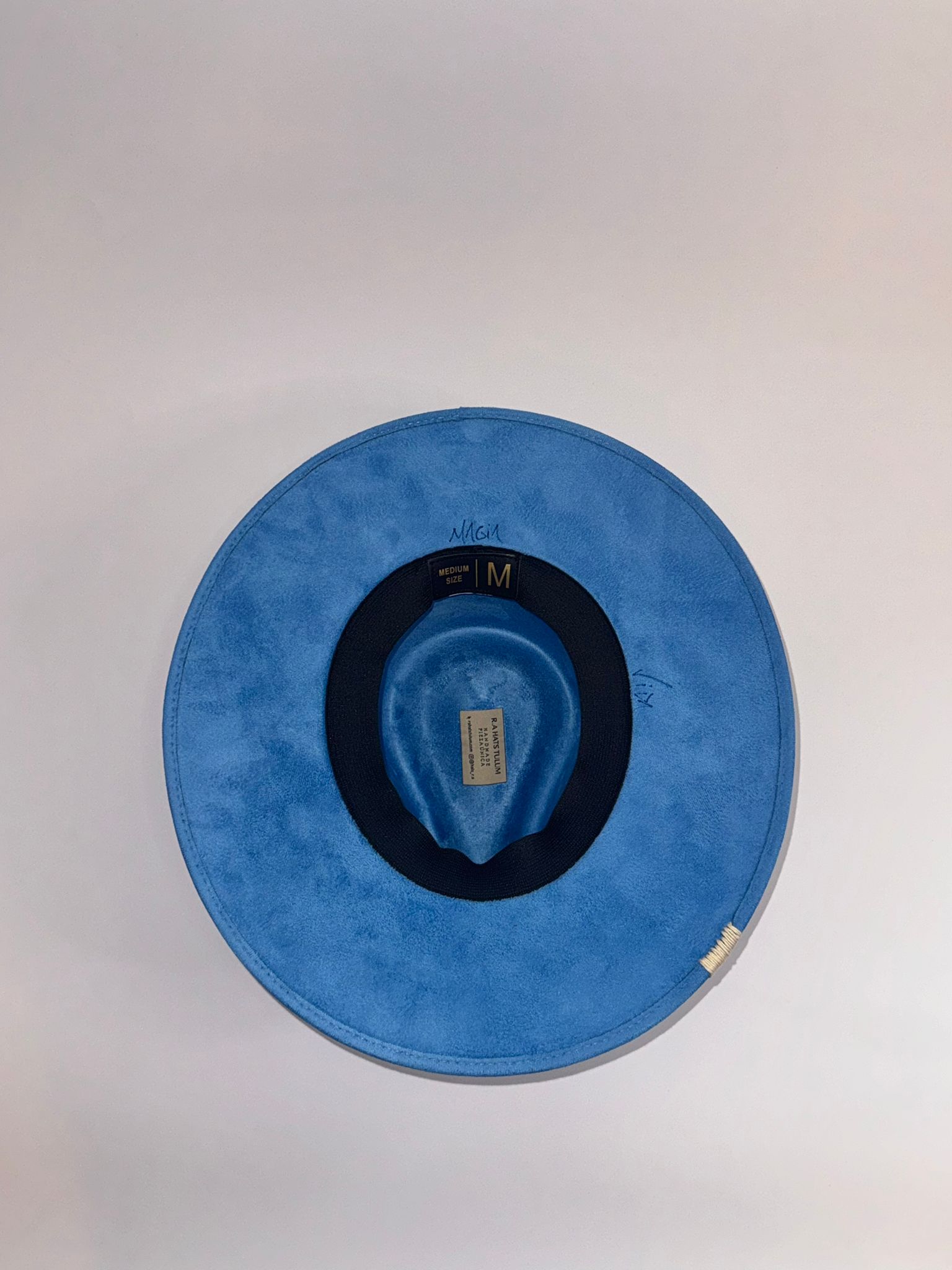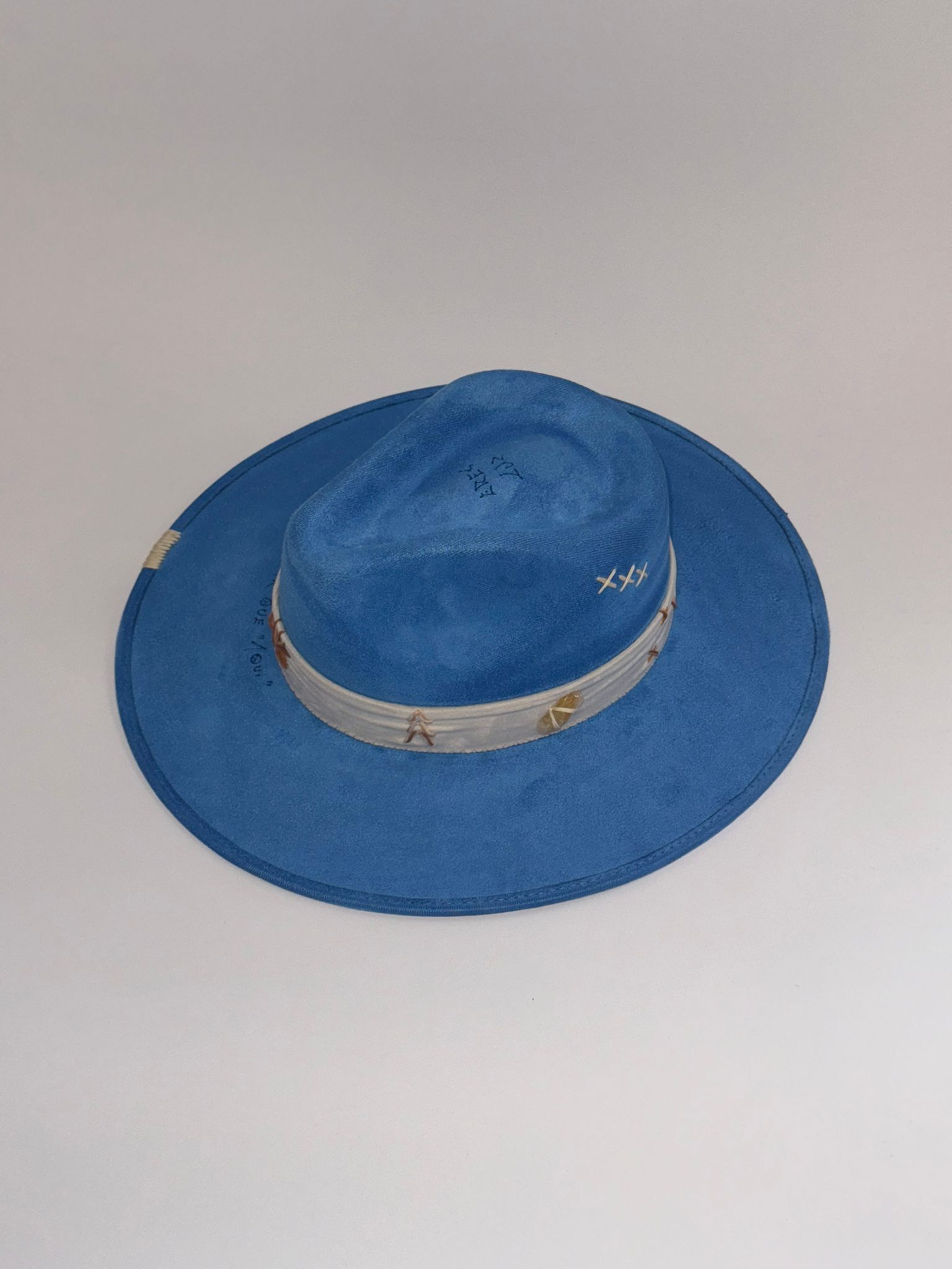 This is a medium-sized, handcrafted hat in a vibrant “Julie Angel Blue” color, made from premium suede. The striking blue hue brings a lively and unique charm, making it an eye-catching accessory. With a wide brim, this hat not only provides sun protection but also adds a bold silhouette to your style. Carefully crafted, it features delicate hand-stitched details and personal inscriptions around the brim, adding an artisanal and exclusive touch. Ideal for those who embrace individuality and artistry, this hat is perfect for making a stylish statement in any setting.