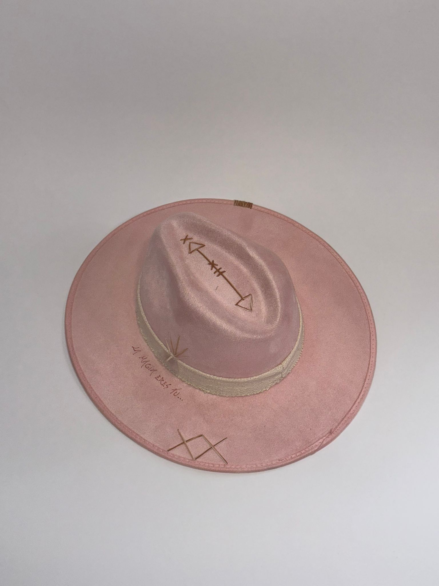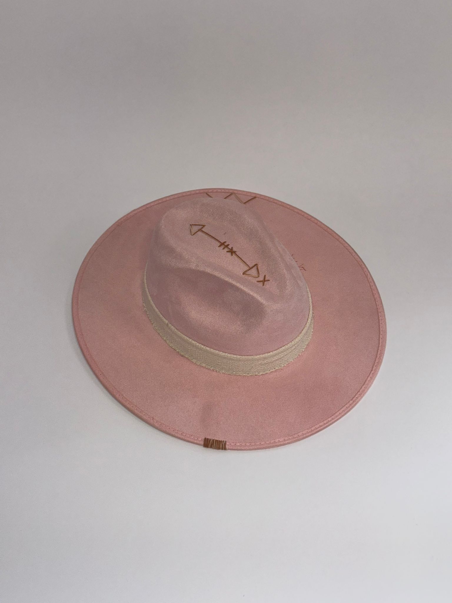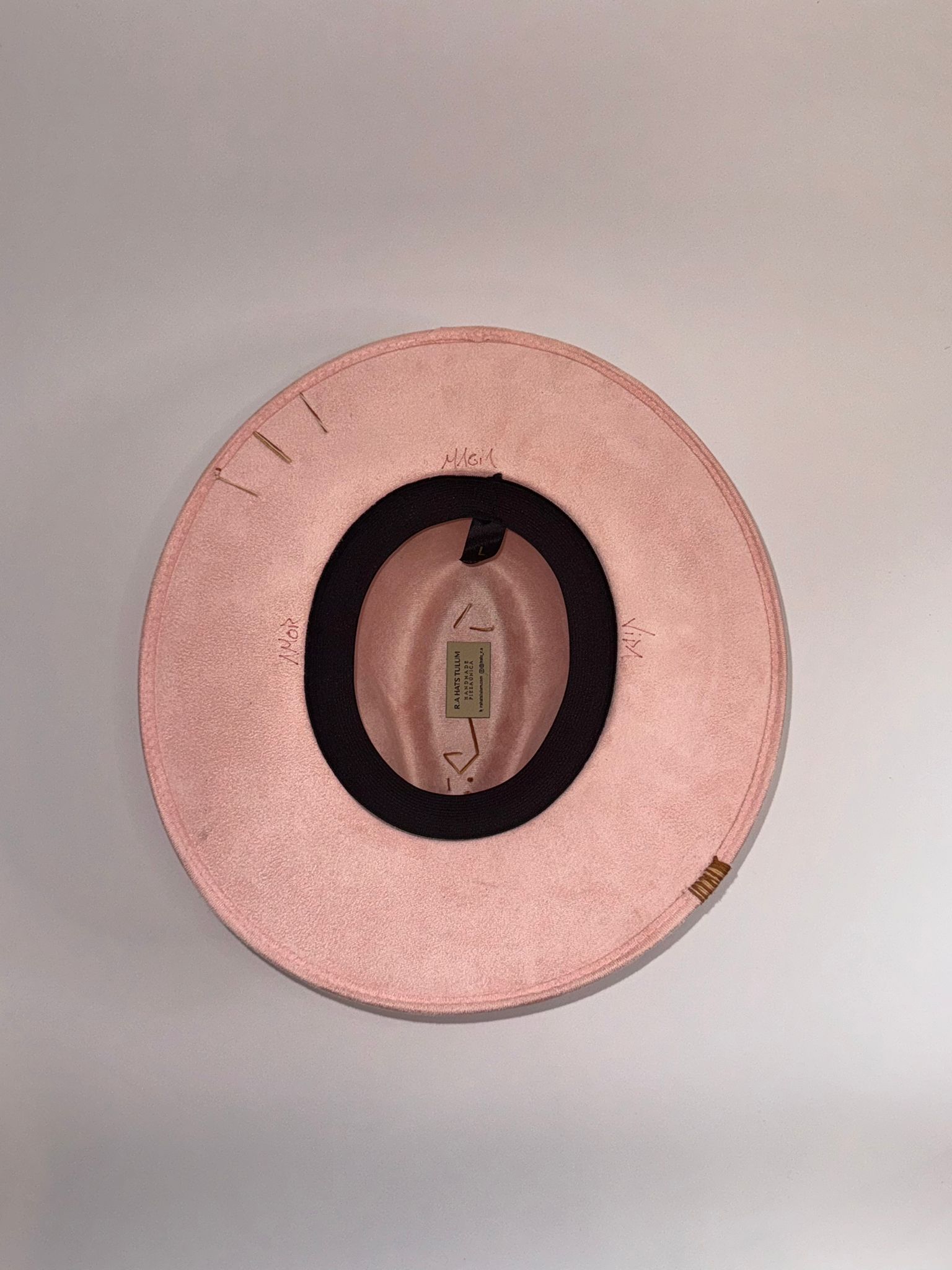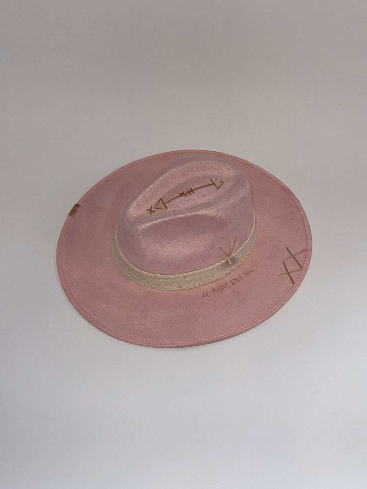 This is a large, handcrafted hat made from premium suede in a soft, elegant pink shade. The delicate color adds a refined, feminine touch, making it a unique and stylish accessory. Featuring a wide brim for both sun protection and an elegant silhouette, this hat is adorned with intricate hand-stitched symbols on the crown and brim. A textured beige band complements the pink, adding a subtle contrast that enhances its charm. Perfect for those who appreciate craftsmanship and gentle hues, this hat is ideal for creating a sophisticated look with a touch of personality.