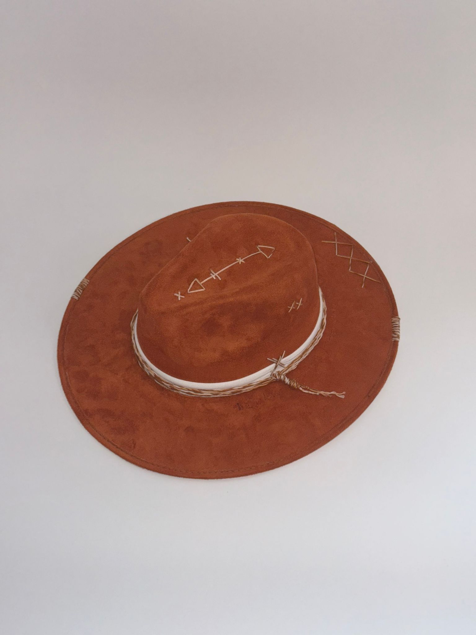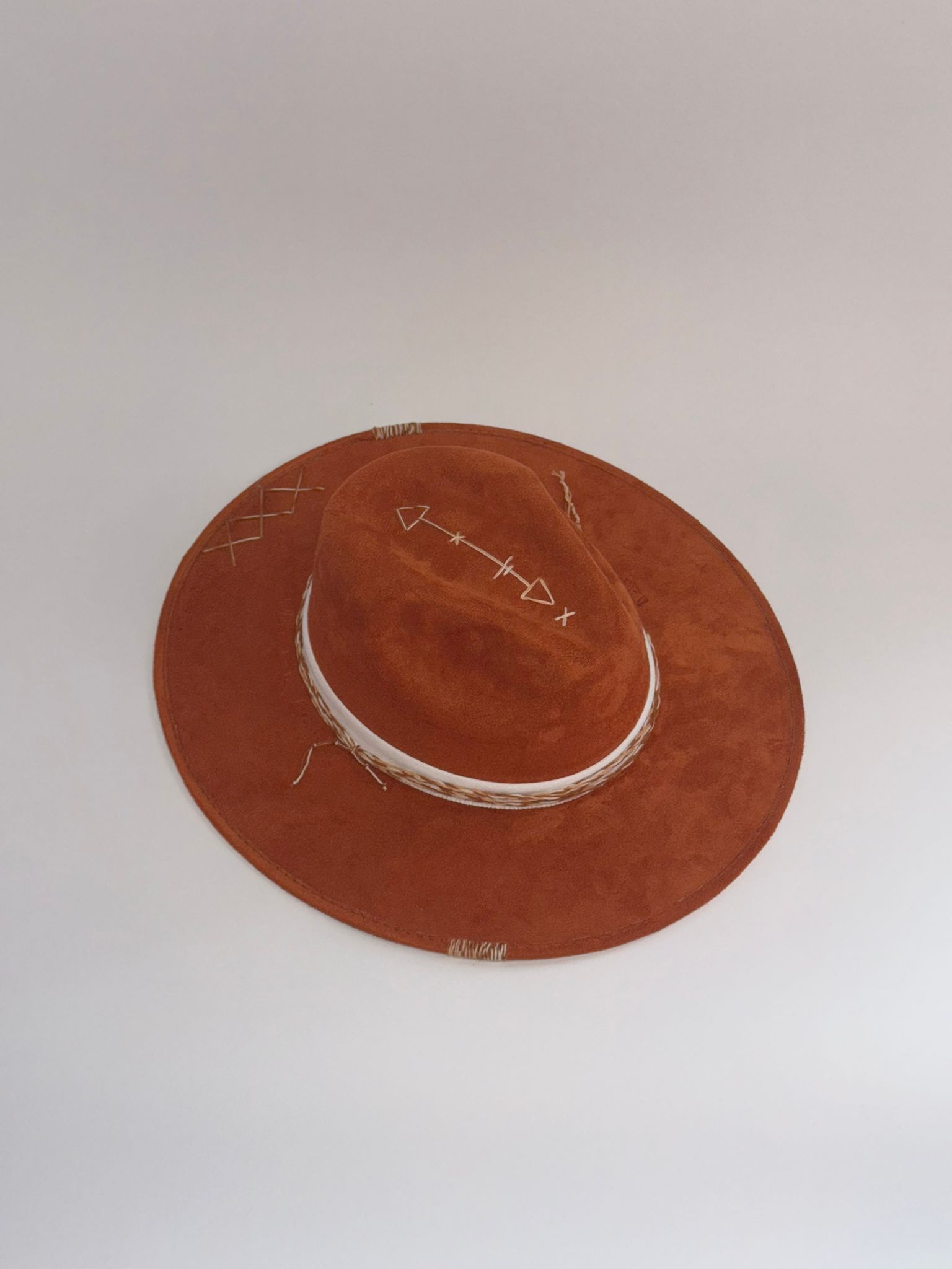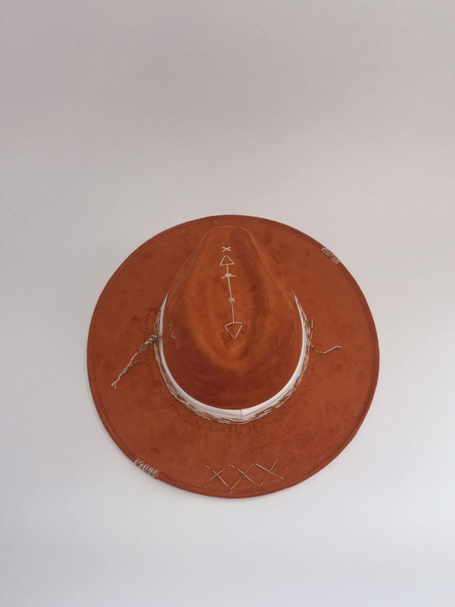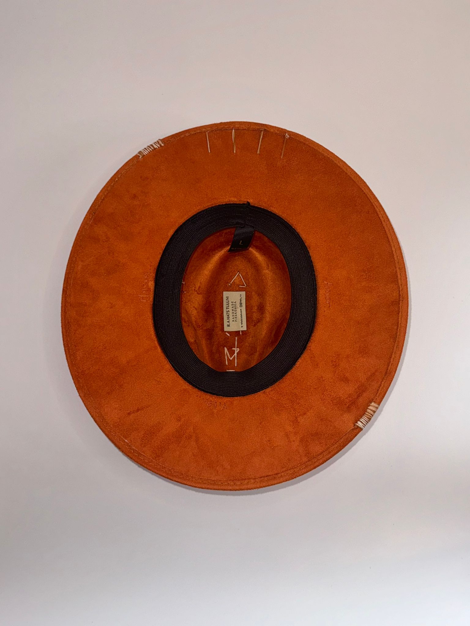 This is a large, handcrafted hat in a vibrant “pumpkin” orange color, made from premium suede. The bold, warm hue captures an autumnal essence, adding a unique pop of color to any outfit. Designed with a wide brim, this hat offers both style and sun protection, perfect for outdoor adventures and festival settings. Intricate, hand-stitched symbols and details on the crown and brim give it a distinctive, artisanal character, making each piece truly one-of-a-kind. Ideal for those who want a blend of rugged elegance and standout style in a high-quality accessory.